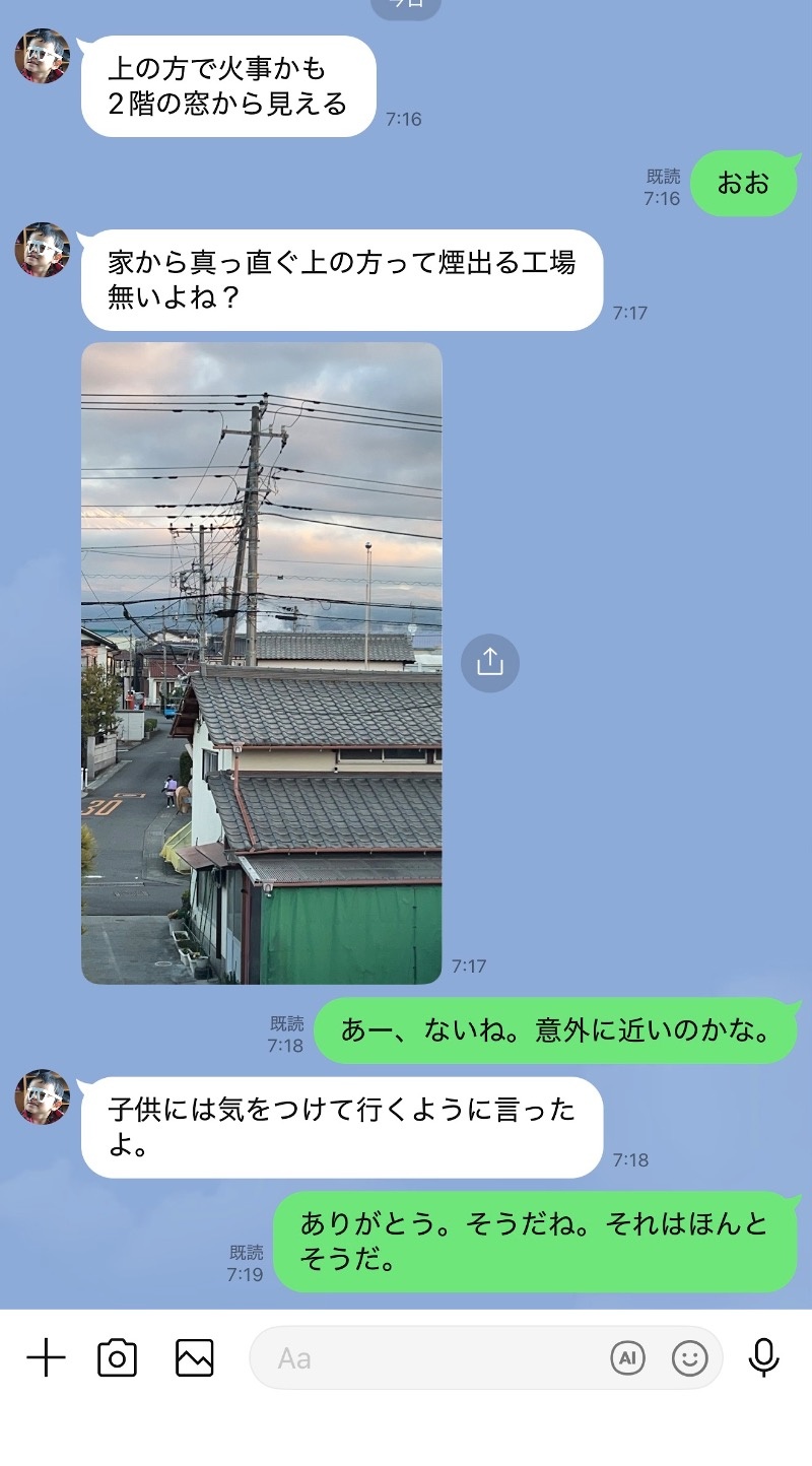 と、奥さんからのLINE。確かに、相当くないところに、煙らしきものが上がっているように見える。